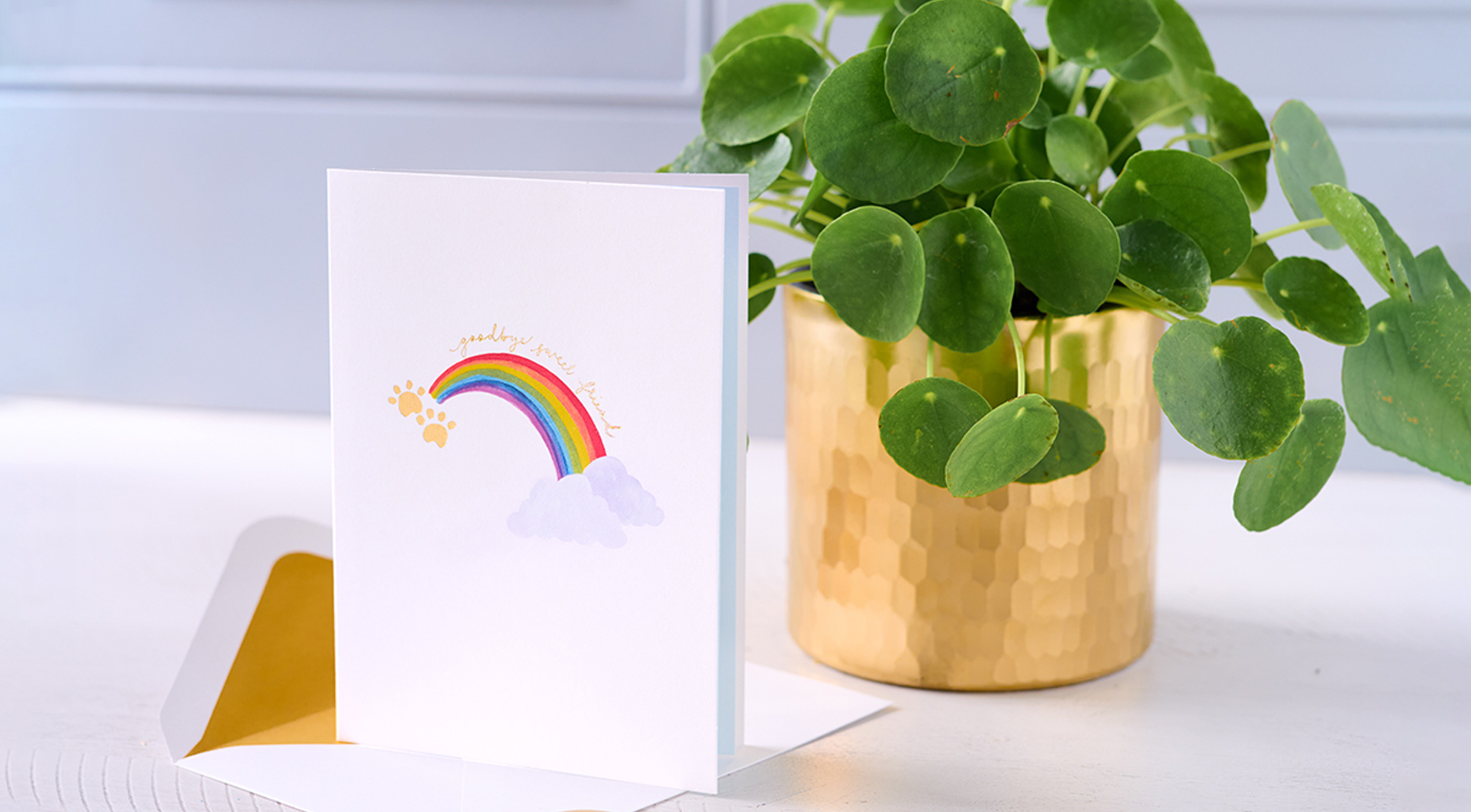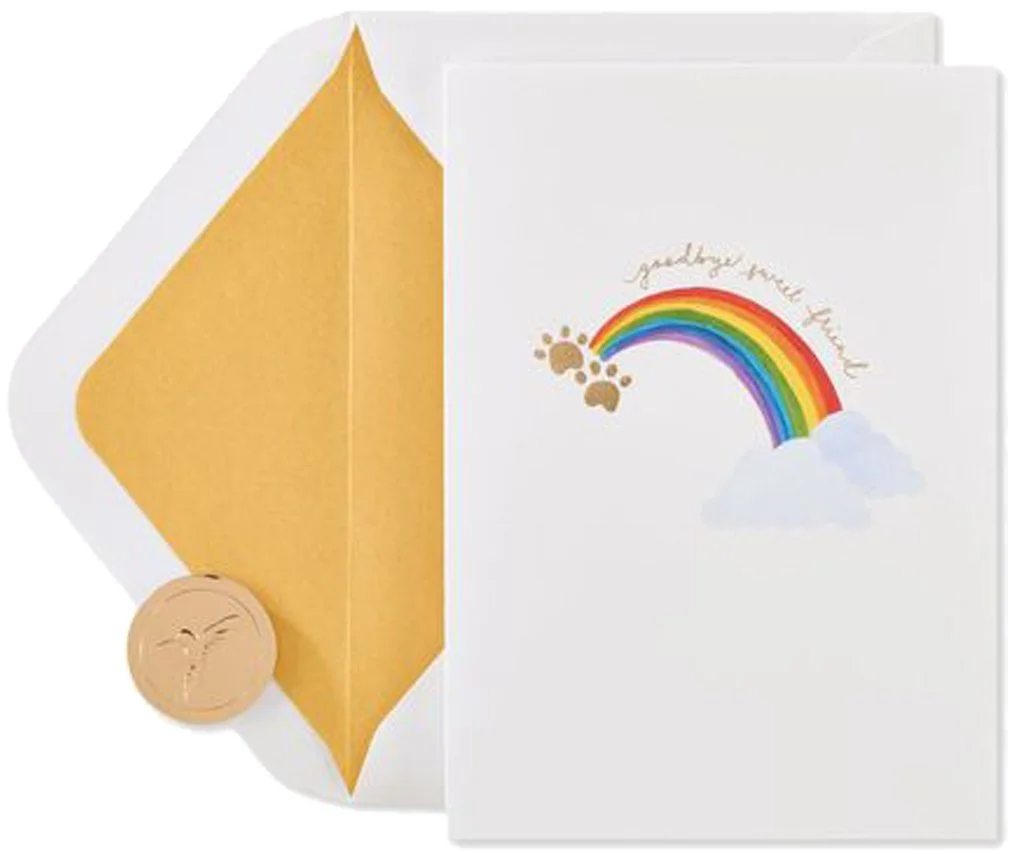 Keep copy short and sincere, incorporating rainbow and paw imagery to evoke warmth and remembrance.